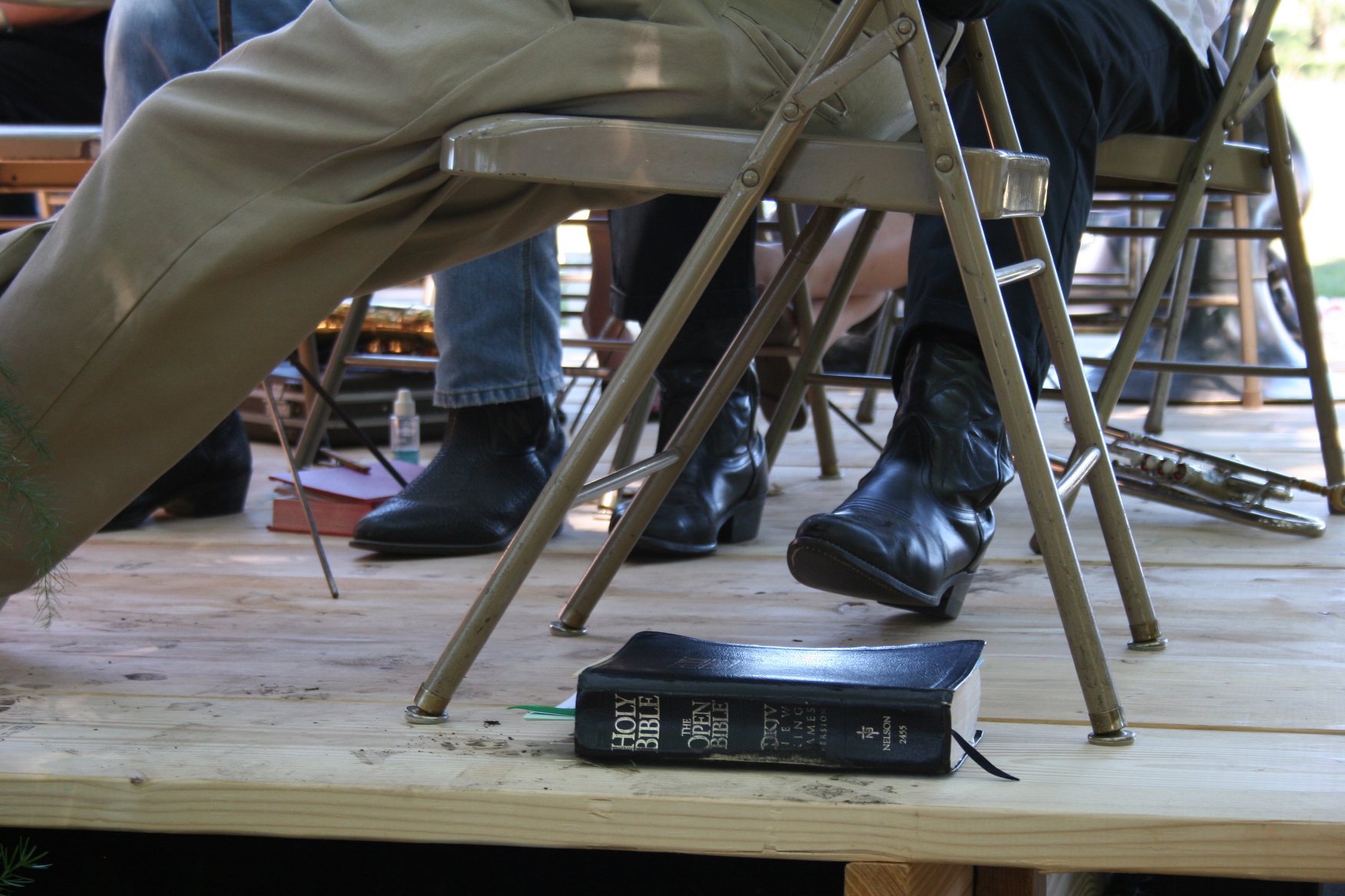 A bible lies on the floor of the stage where the band played and the preachers preached.