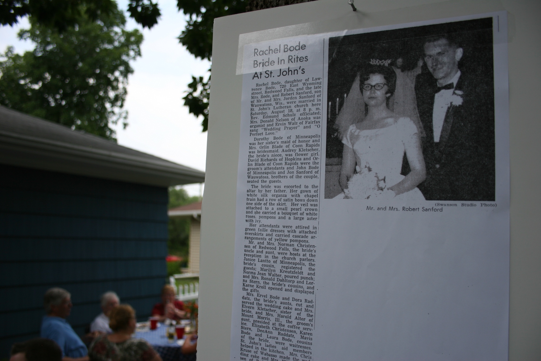 A newspaper account of my aunt and uncle’s wedding 50 years ago is tacked onto a tree at their recent anniversary party.