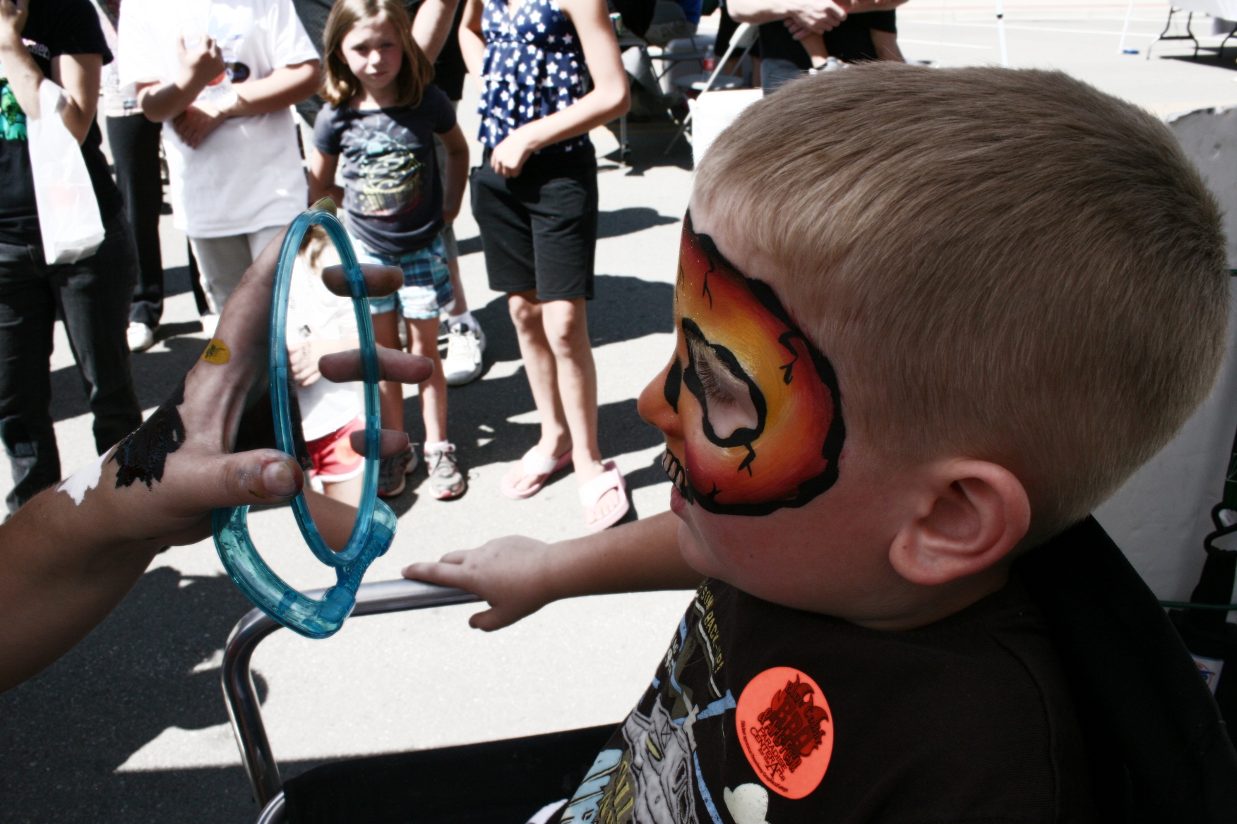 Jodi Gustafson of Big Shoe Entertainment begins transforming young Owen’s face into a Ghost Rider’s skull mask at the recent Blue Collar BBQ & Arts Fest in Faribault.