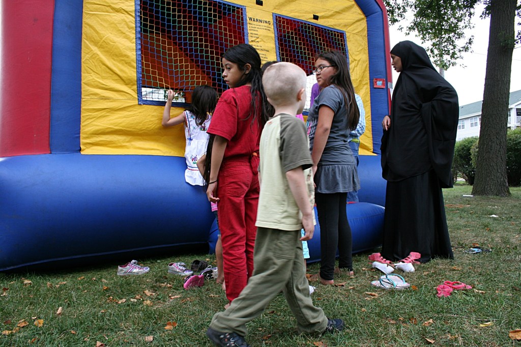 Waiting at the bouncy tent.