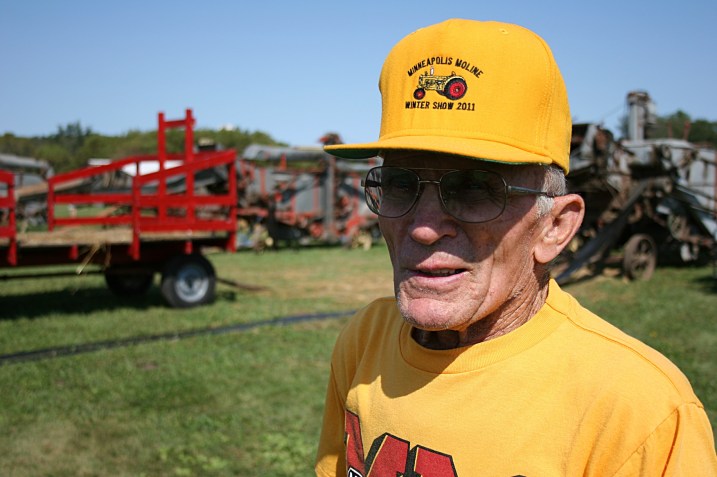 Bill Becker of rural Northfield mans the Minneapolis Moline which powers the threshing operation.