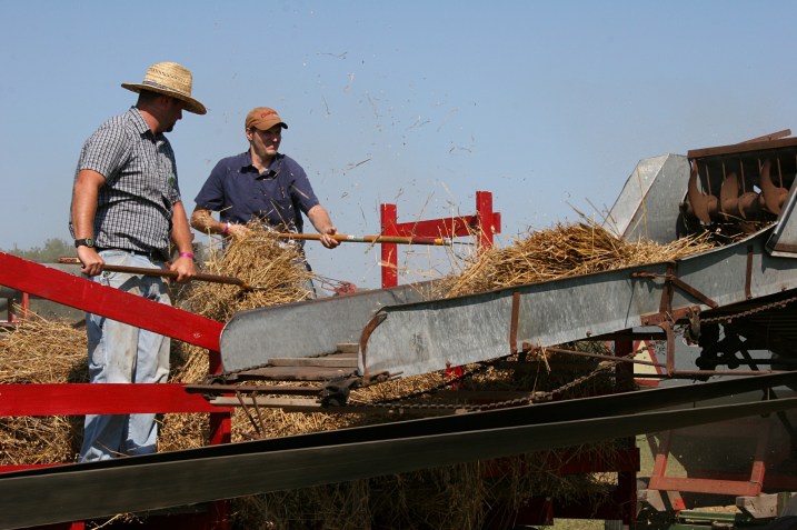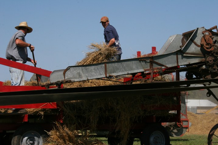 An overview of the threshing equipment and process of separating the oats kernels from the stem.