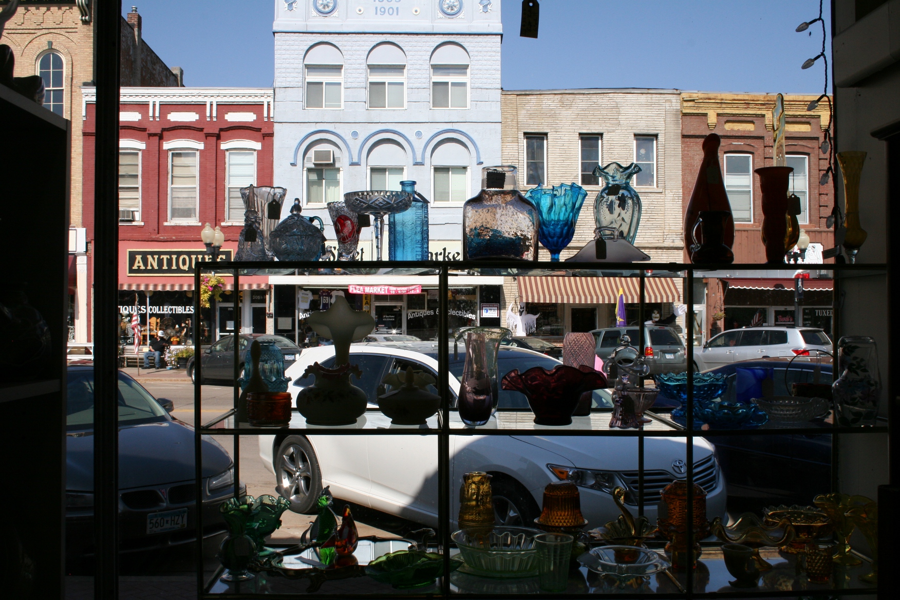 Inside the same antique shop, looking across the street at a row of historic buildings.