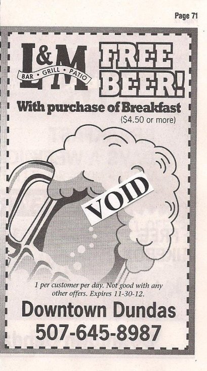 SITTING IN THE RECLINER the other night perusing a coupon book recently inserted in my local newspaper, the Faribault Daily News, I came upon this deal from L & M Bar & Grill in downtown Dundas, just south of Northfield: