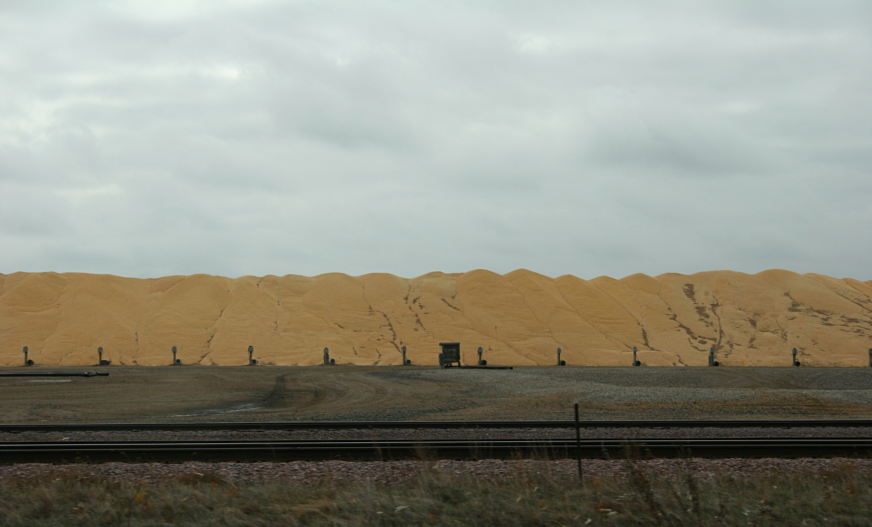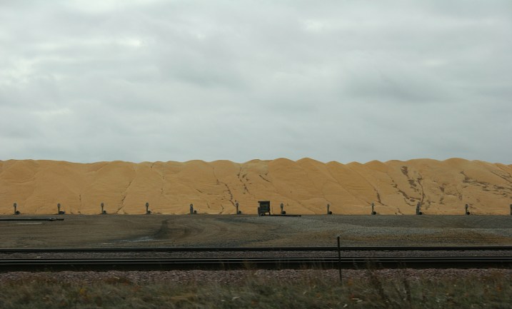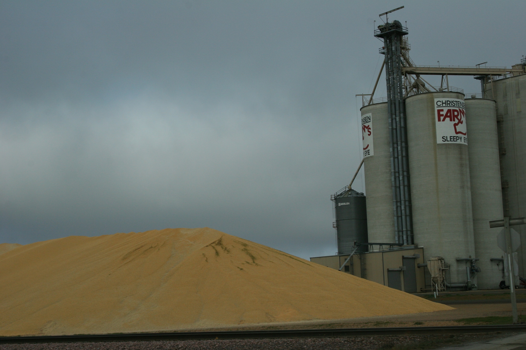 These towering elevators and corn pile at Christensen Farms near Sleepy Eye break up the flat landscape.