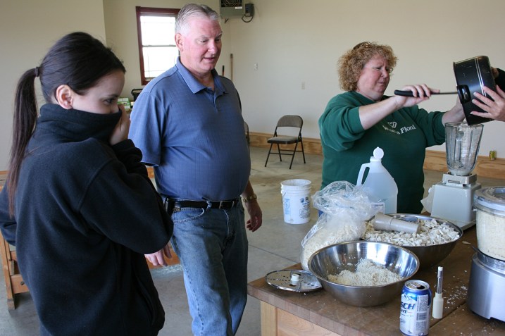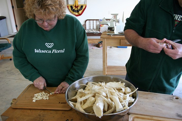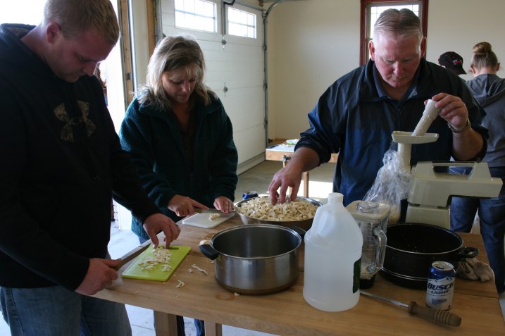 But it wasn’t the horseradish which drew Randy and me to drive more than two hours to Brian and Vicki’s rural acreage to stand at tables in a garage on a chilly Saturday to process horseradish that would soon overwhelm us with eye-stinging fumes.