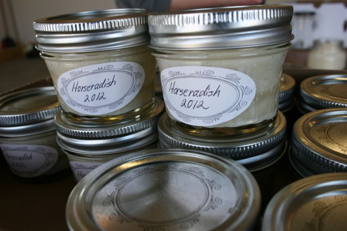 Back in the day, my dad and bachelor uncle, Mike, would occasionally make horseradish. Eventually my sister Lanae (and later her husband, Dale, too) began assisting Dad with the digging and washing and peeling and slicing and processing of this pungent root. And then, when the creamy white sauce was bottled, Dad would haul it down to the Vesta Community Hall for the annual Senior Citizens’ craft/bake/produce sale. Folks would wait in line to snap up Vern’s homemade horseradish.