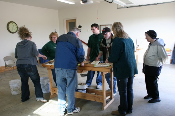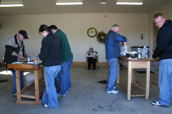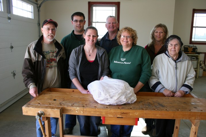 The 2012 horseradish making crew, front row, left to right, Randy, Tara, Lanae and Arlene. Back row: Andy, Brian and Vicki. I’m obviously missing from the photo as are Al and Alyssa, who arrived later.