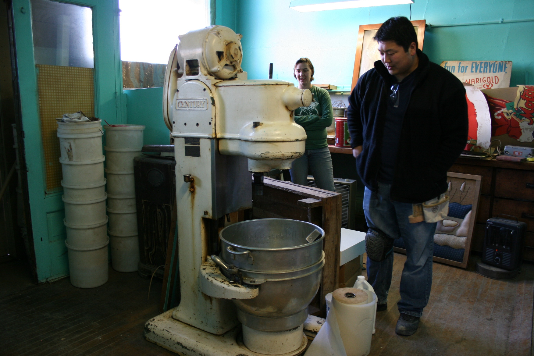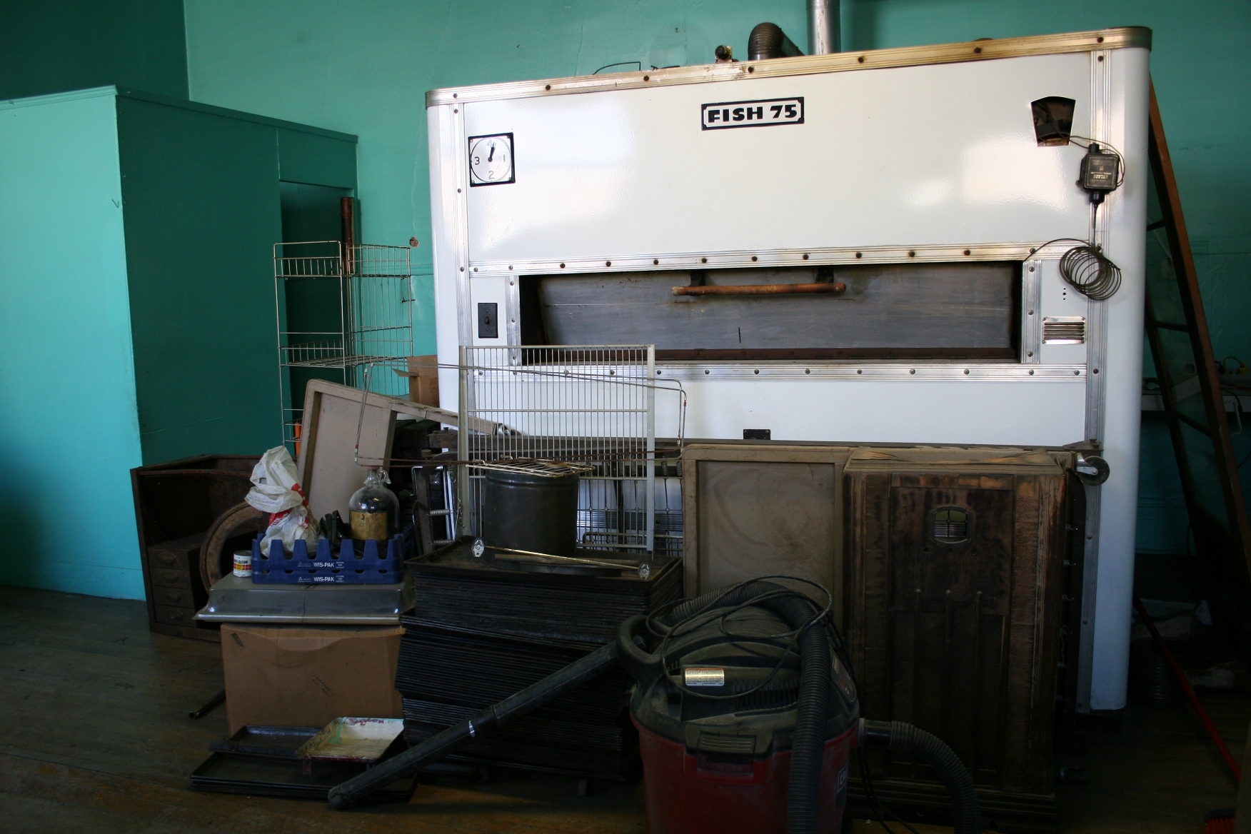Fifty loaves of bread could be baked in this 1960s vintage two-ton rotary oven. It occupies much of the space in the middle room which will become a cozy coffee shop. This room and the front former bakery/soda fountain area were painted teal after Bob’s niece first chose that hue for the bathroom. Bob loved the color so much that he painted the rest of the place teal. The color has been on the walls for 50 years. No, they are not keeping the teal color.