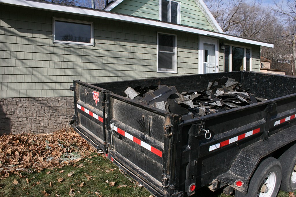 Bad Tamko shingles torn from the roof and tossed into a trailer at the front of our house.