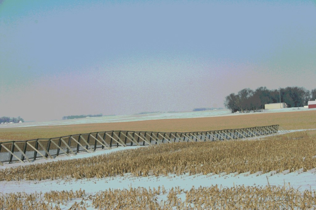 West of Springfield, a snow fence emphasizes the horizontal lines of the prairie.