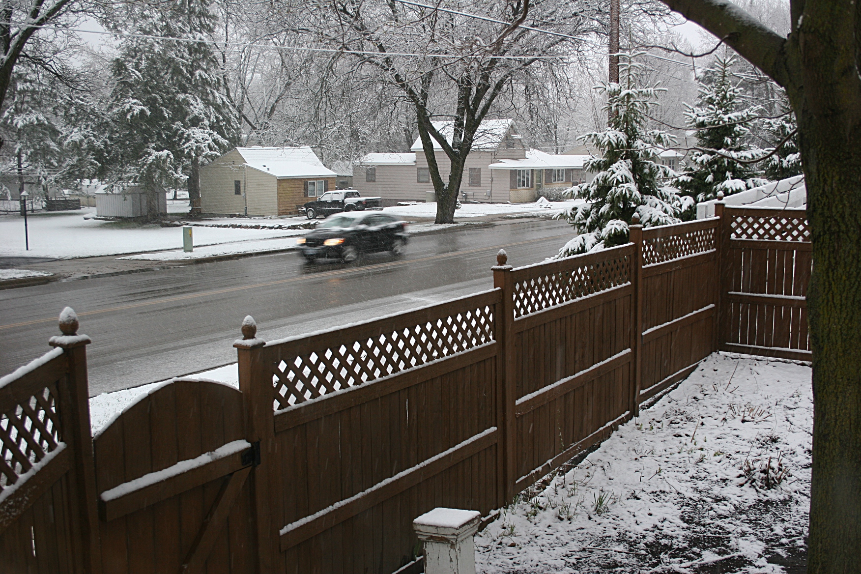 Weather-wise, snow continues to fall, as shown in these two photos just taken from my bedroom window. No taking the camera outside during snowfall.
