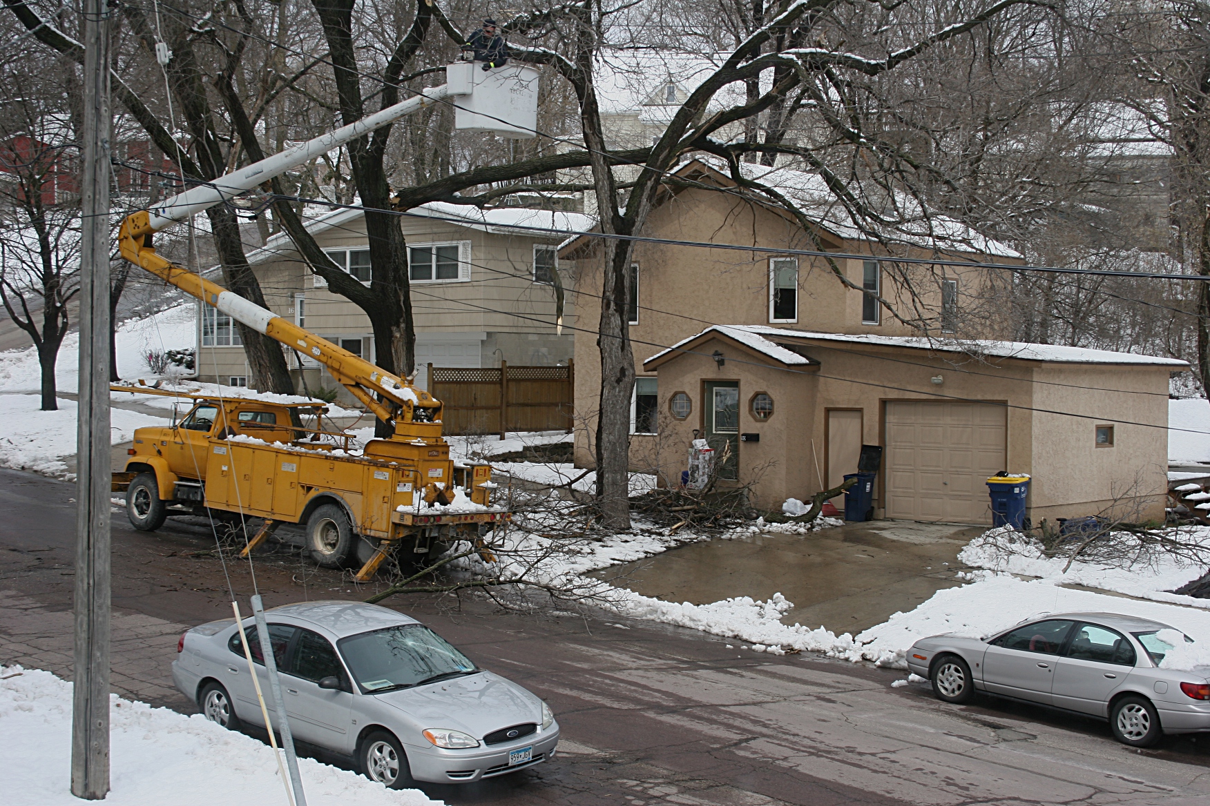 Branches are broken and littering yards. Power lines are sagging from the weight of the heavy wet snow.