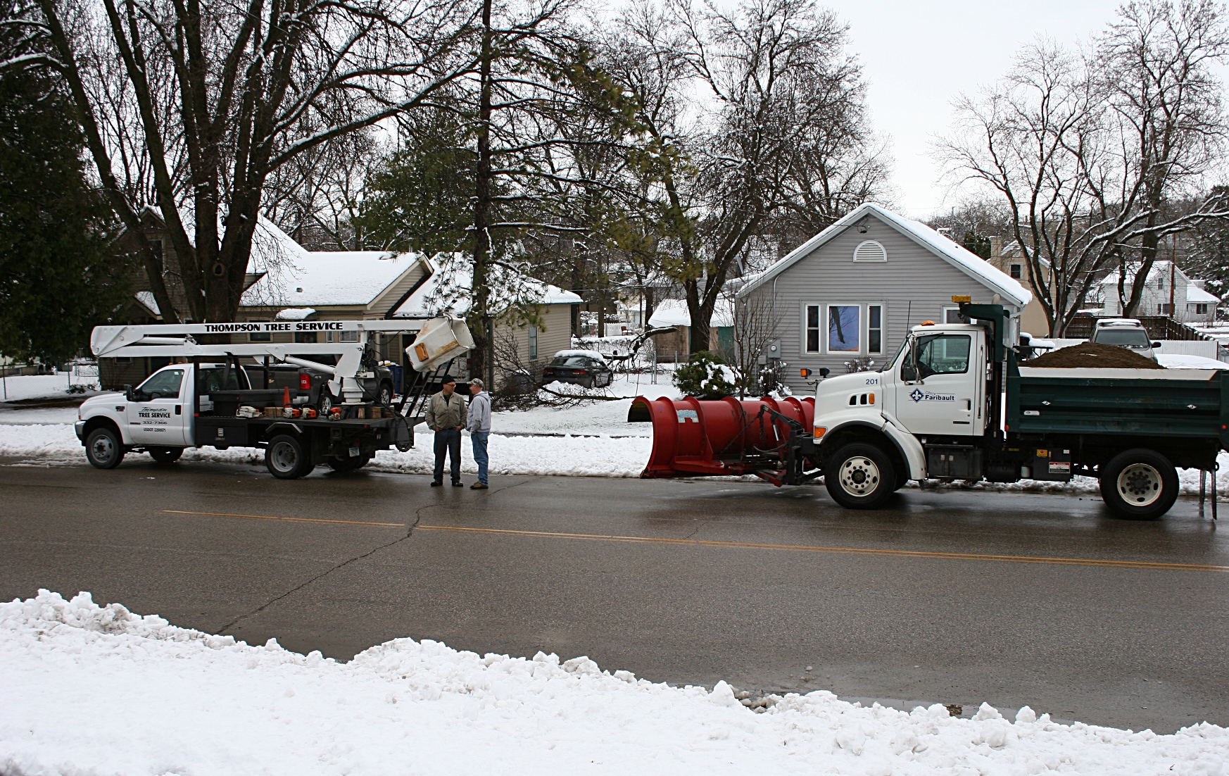 A City of Faribault snowplow driver and a Thompson Tree Service worker confer along Willow Street this morning.