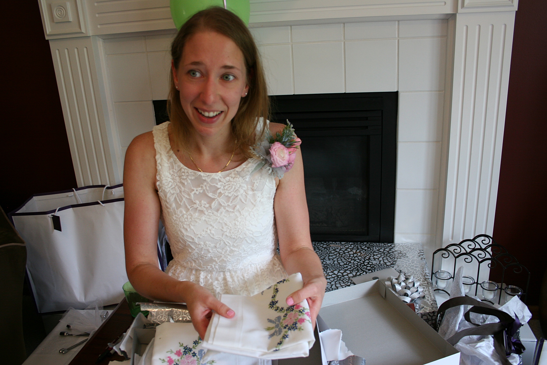 The most emotional moment of the afternoon came when Amber opened linens hand embroidered by her future husband’s maternal grandmother, Beatrice (who died decades ago). The linens were to be gifted someday to Beatrice’s grandson’s bride-to-be. And this was the day when my daughter’s future mother-in-law delivered the precious packages. The embroidered hues of the flowers are the wedding couple’s colors, making this gift even more remarkable as Grandma Beatrice could not have known this.