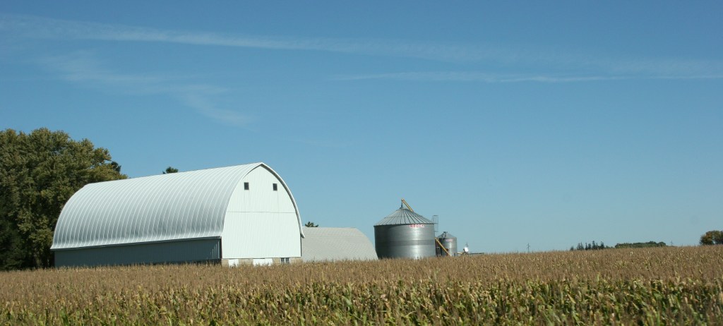 Barns, like this one, rise above the soon-to-be-harvested corn fields.