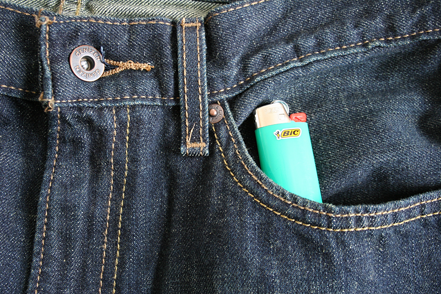 Surprise. These jeans purchased at Target came with a Bic lighter stashed inside a front pocket and repositioned in this staged photo.