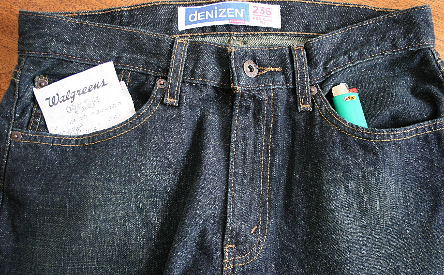Jeans purchased at Target with a receipt in one pocket and a Bic lighter in the other.