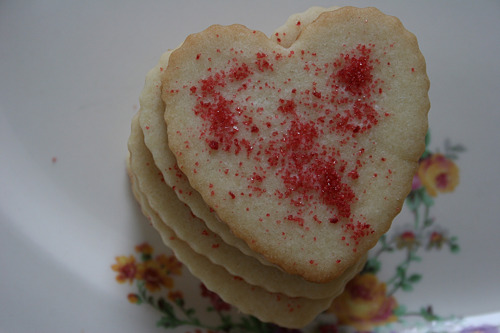 I decided heart-shaped cookies would be perfect given the date. And so I pulled out my favorite roll-out cookie recipe, the one my mom used when I was growing up. It’s my go-to “sugar cookie” recipe.