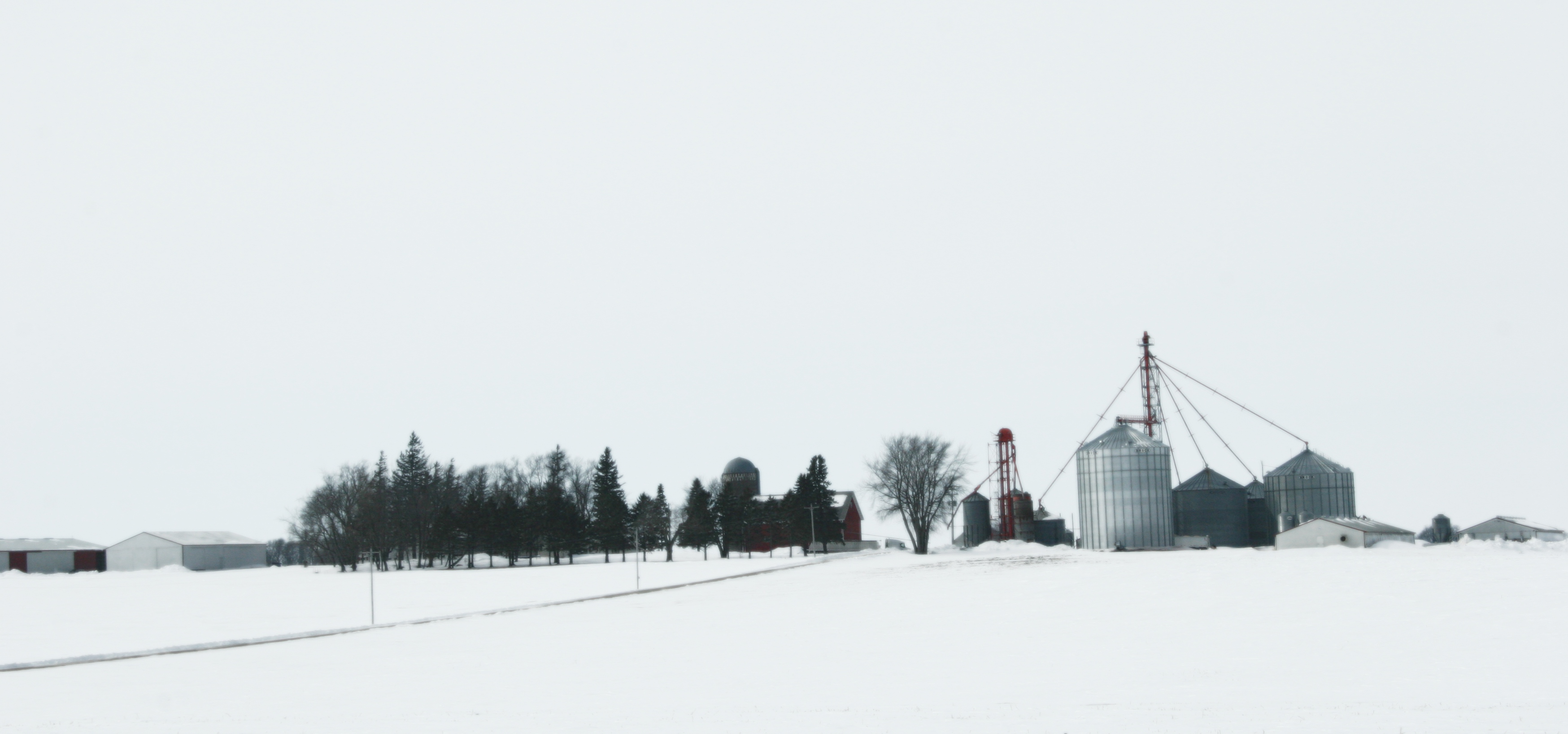 Power lines and roads cut horizontal swaths. Farm sites beckon like a welcome oasis in a sea of white. Bare-branched trees flag the sky.