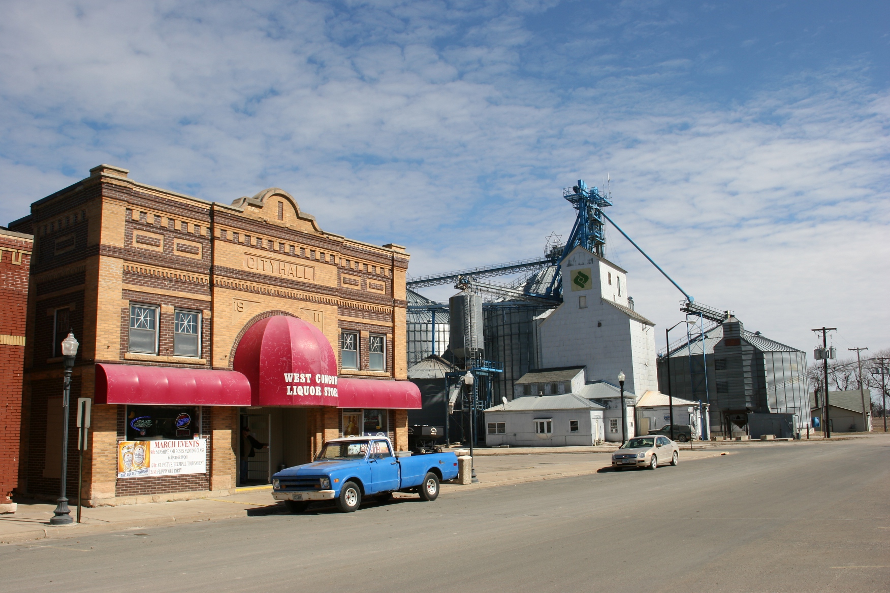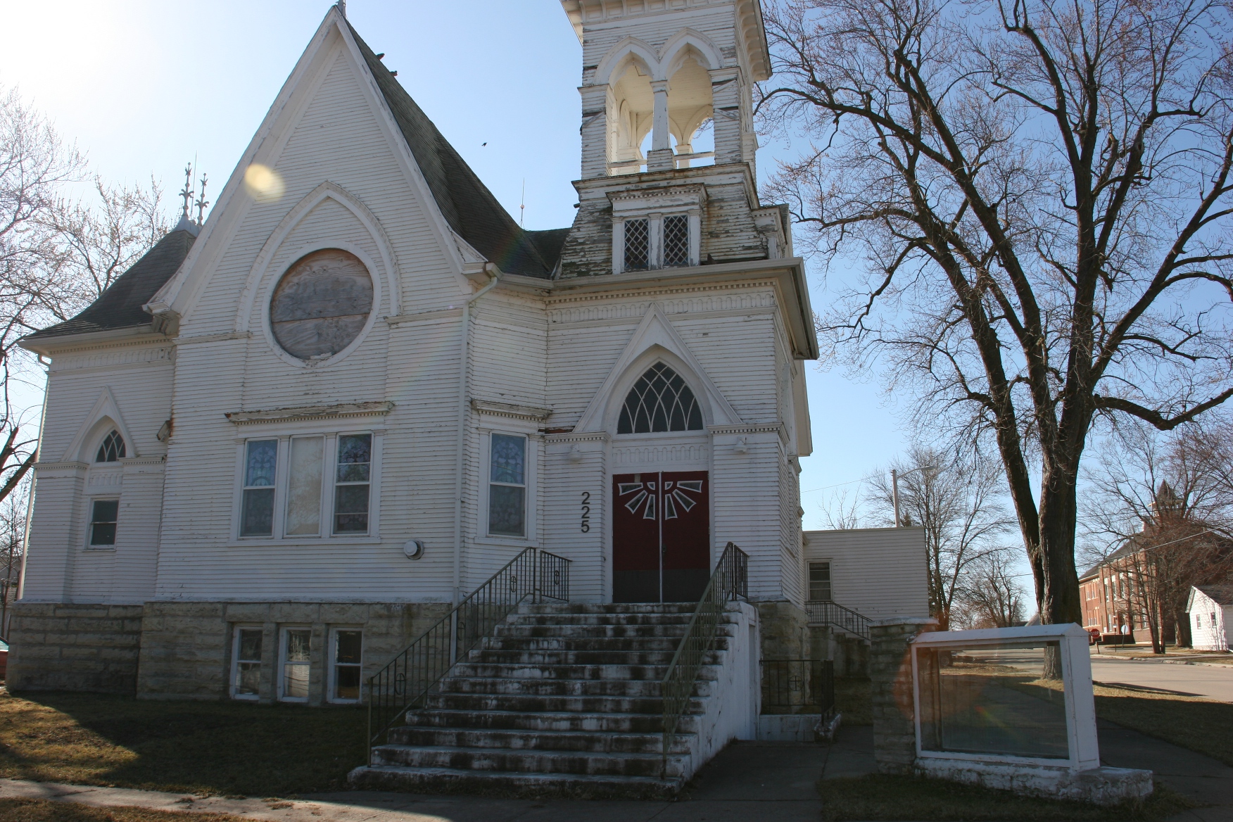 The 1902/1914 school is on the left, the 1936 gym on the right. Museum left, community center right. To enter, use the door between the buildings, in the area where the red car is parked in this photo. The school closed in 1991.
