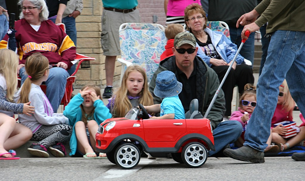 Little Ivan arrives for the parade in a car pushed by his dad, Jake.