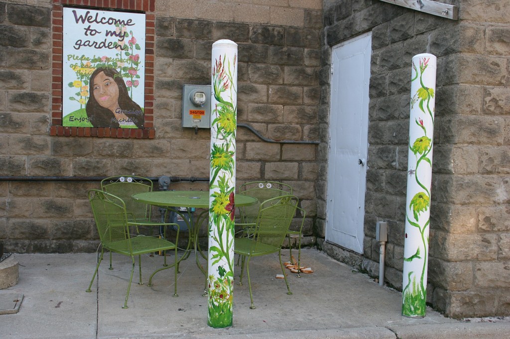 That’s Michelle’s portrait hanging above the dining space in the garden.