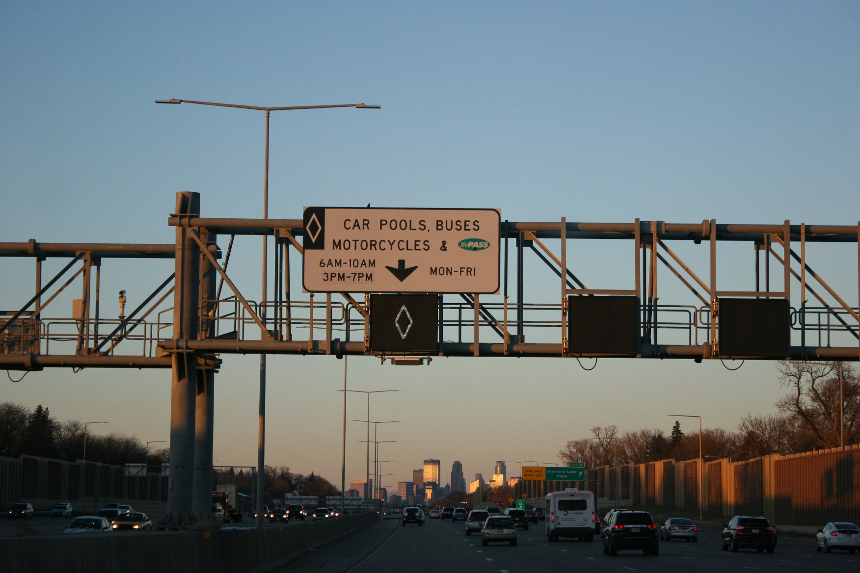 Signage for the “sane lane” nearing downtown Minneapolis.