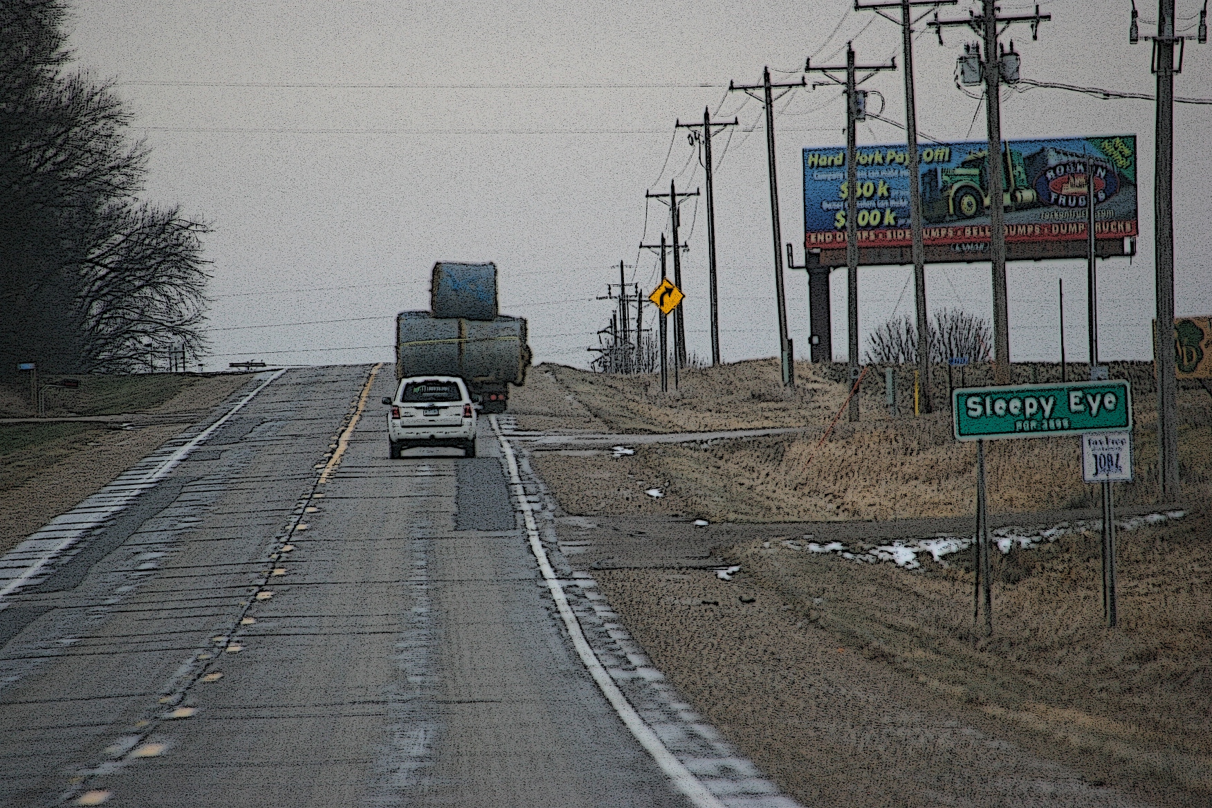 On the road in rural Minnesota » Bales on trailer, 84 going up hill