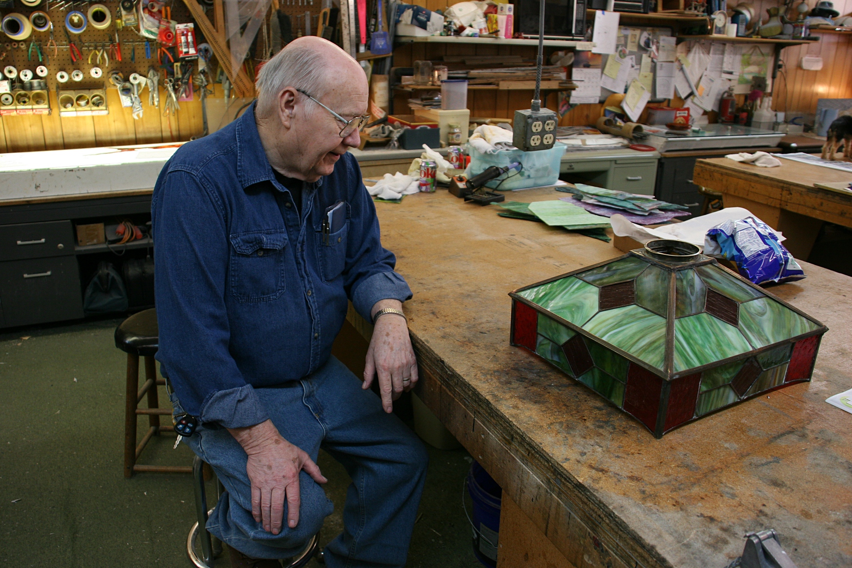 In his workshop, Mike talks to customers who’ve stopped by to pick up their restored light shade.