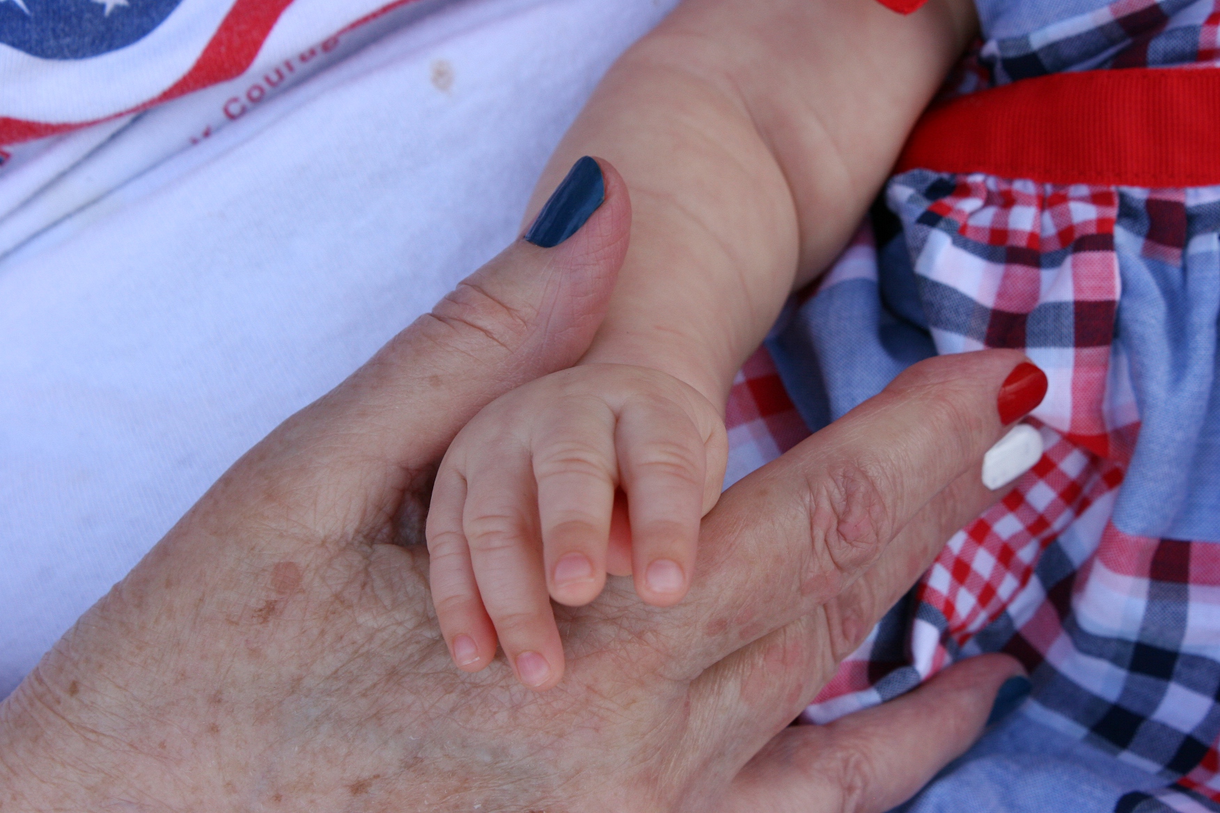 The hand of an 83-year-old and a three-month old.