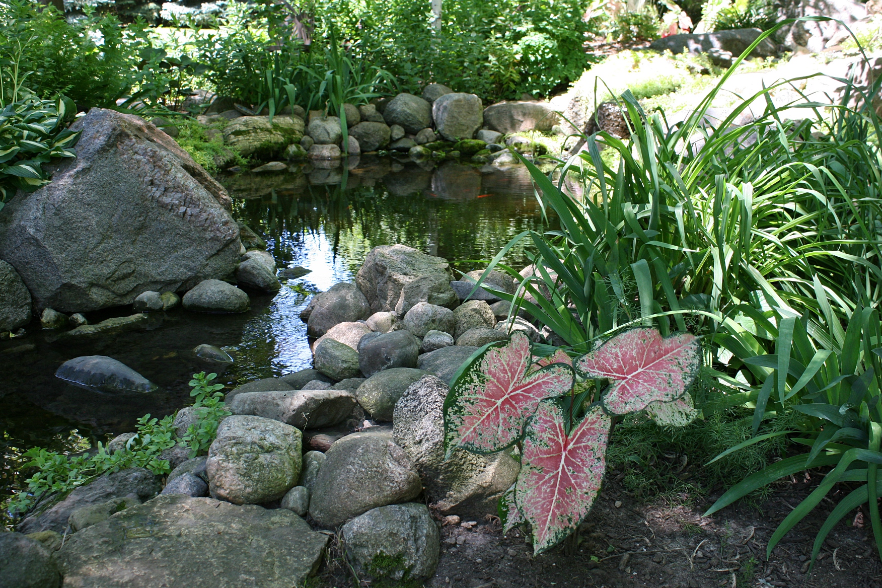 A pond, surrounded by lush plants, is situated under shade trees next to the house.
