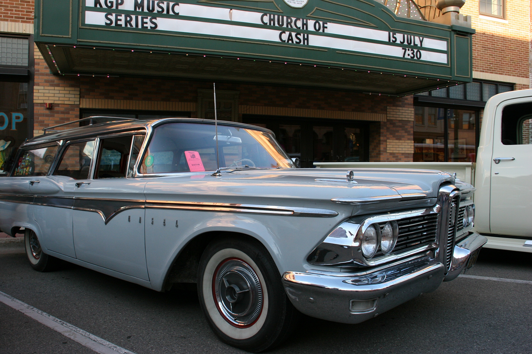 A 1959 Edsel Village Wagon is parked in front of the Paradise Center for the Arts with its restored marquee.