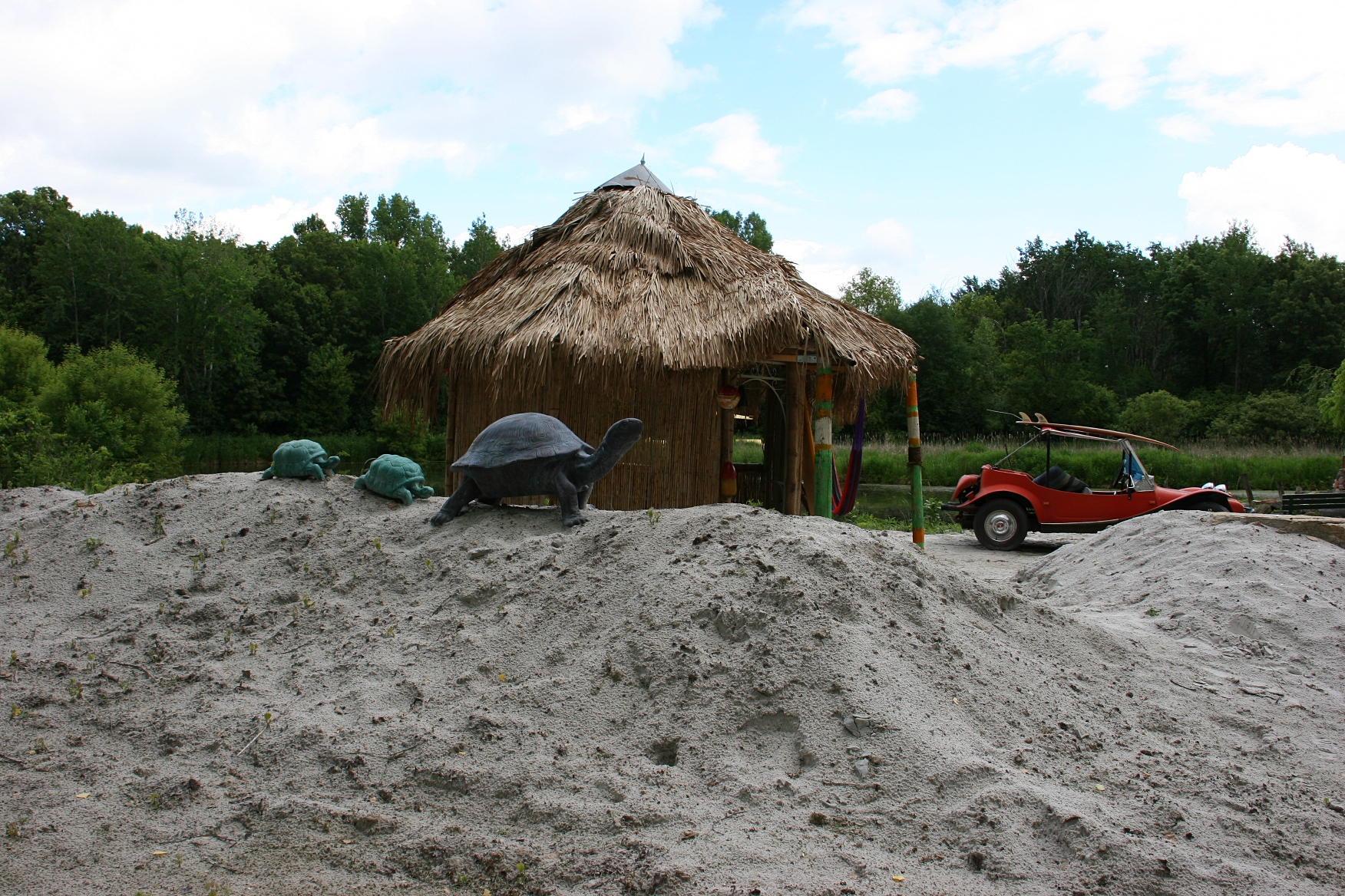 Sand is hauled in to help stage the beach scenes like this cabanna, added since my last visit.