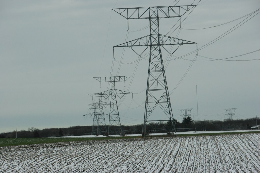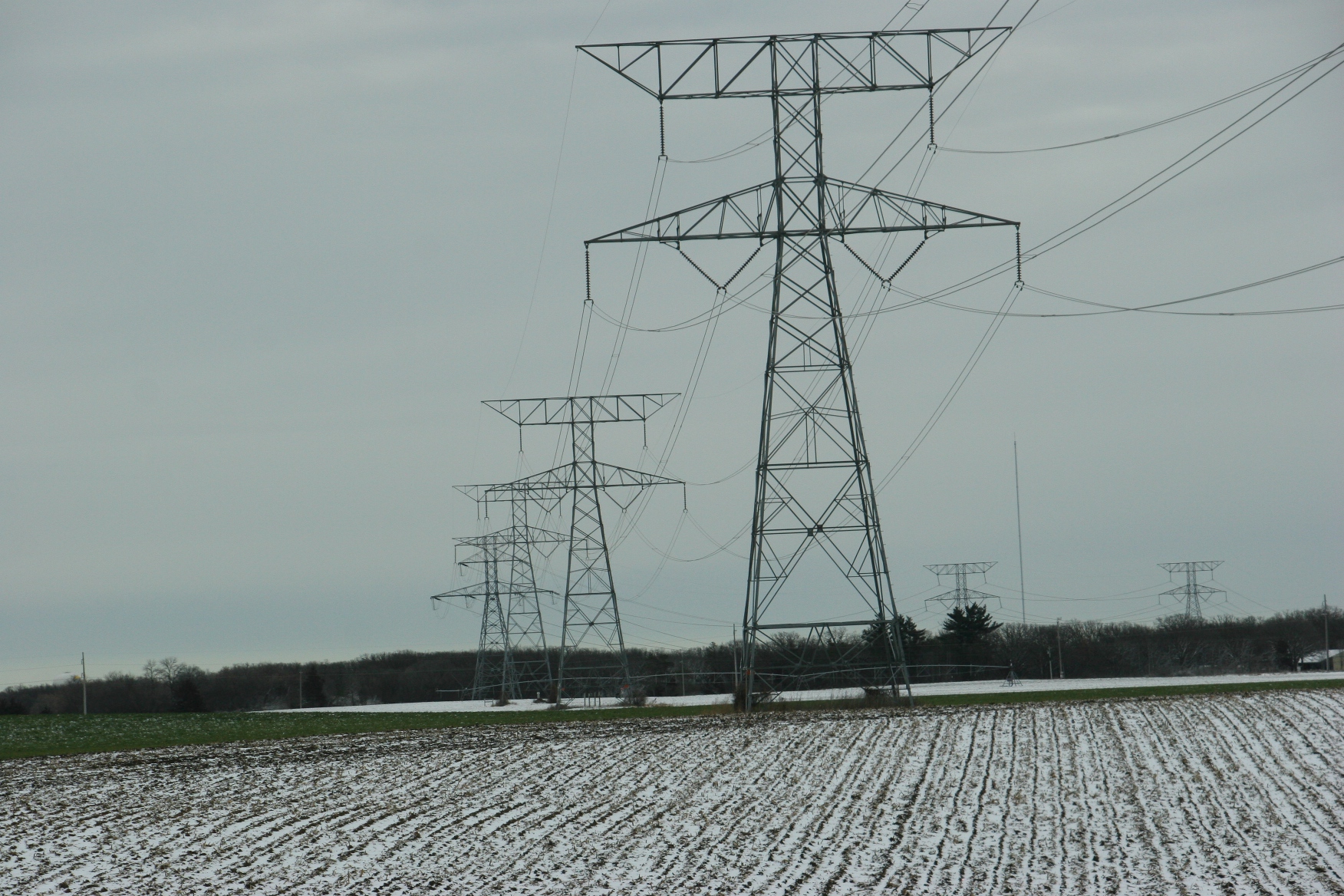 Under grey skies on the flat land north of Monticello, snow dusts fields.