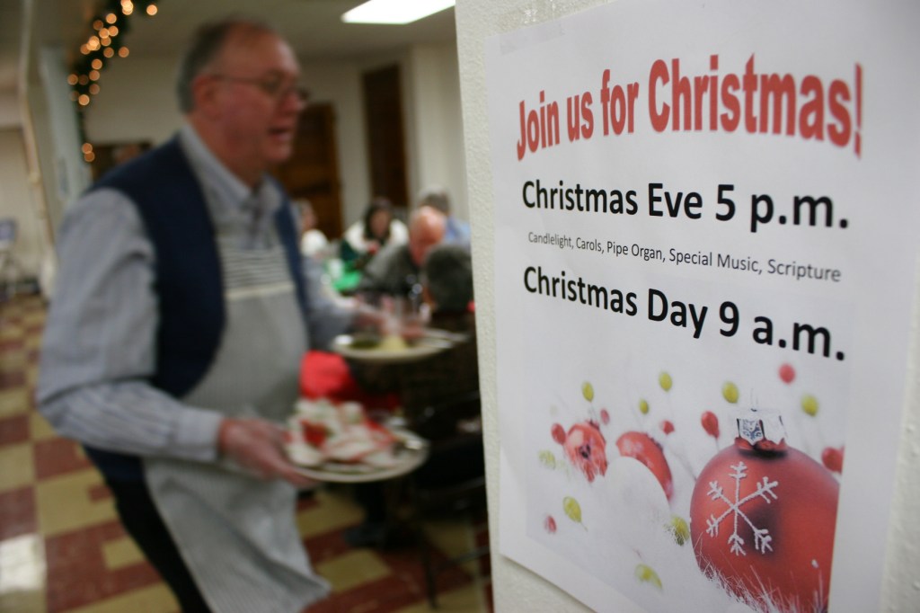 Experiencing the spirit of Christmas at a community dinner in Faribault » christmas-dinner-11-sign-man-clearing-dishes