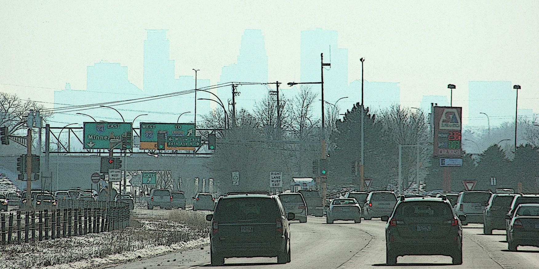 The outline of the Minneapolis skyline appears in the hazy distance while traveling along Minnesota State Highway 252.