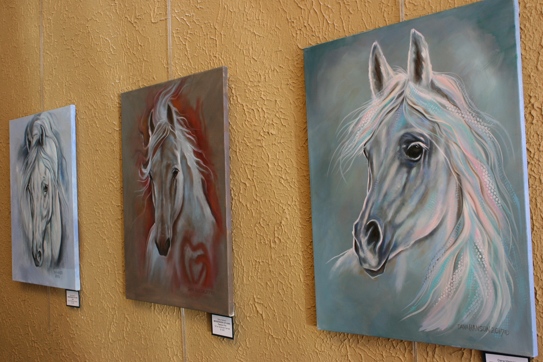 Dana’s exhibit includes a trio of horse paintings titled MESSENGERS OF HOPE. They are, left to right, subtitled “Light,” “Passion Fire” and “Grace”