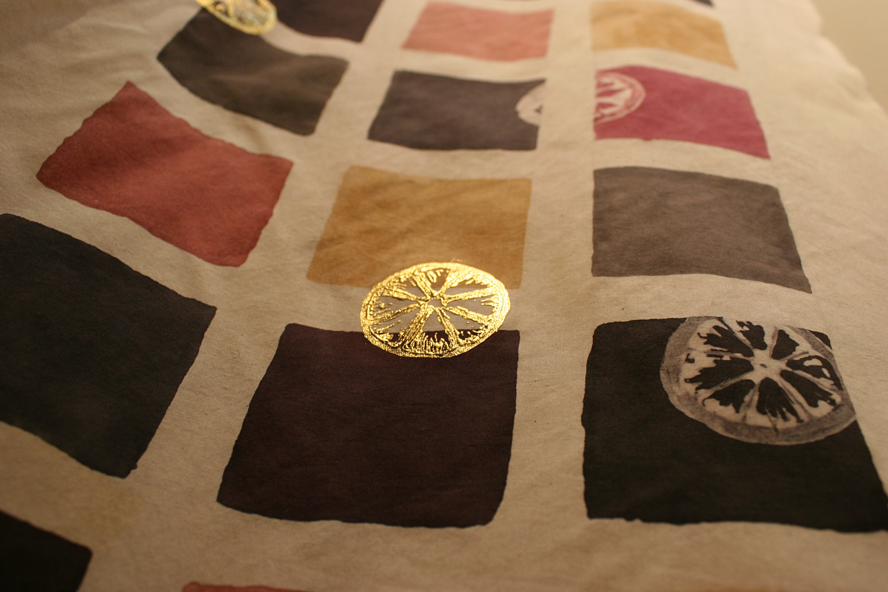 A close-up of Judy’s panel tagged as “When Life Gives you Lemons make Art.” She used lemon juice for a discharge and dyed in cochineal. The repetition in the art is in the style of Andy Warhol.