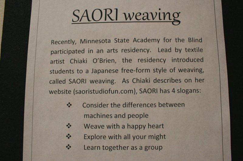 With that background, I was especially drawn to a section of the Student Art Exhibit at the Paradise Center for the Arts in Faribault. It features SAORI weaving, free-style hand-weaving that originated in Japan. Minnesota State Academy for the Blind students created the woven art under the guidance of artist-in-residence Chiaki O’Brien.