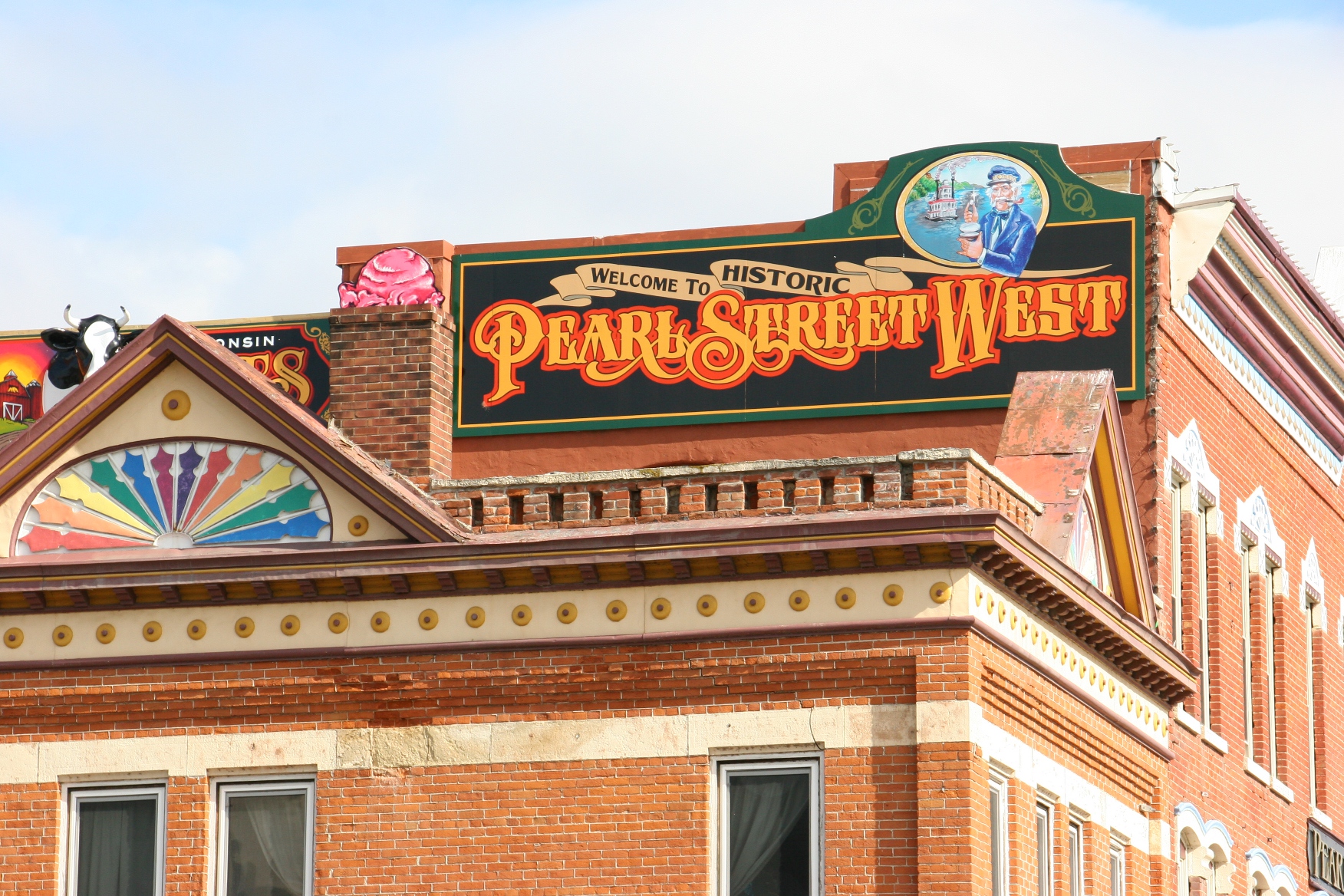 This colorful signage welcomes downtown visitors to the Pearl Street Historic District.