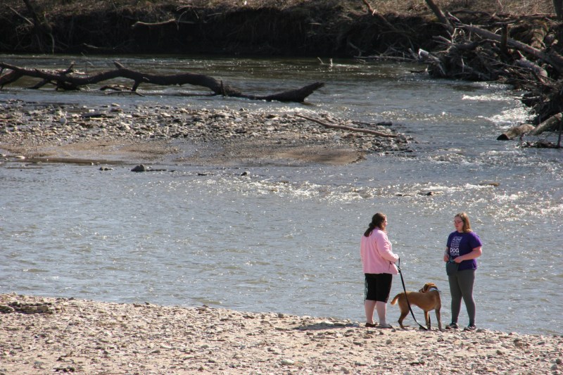The banks of the Straight River proved a popular spot Saturday afternoon. The woman in the purple is wearing a t-shirt with this message: “Leave me alone. I’m only speaking to my dog today.”