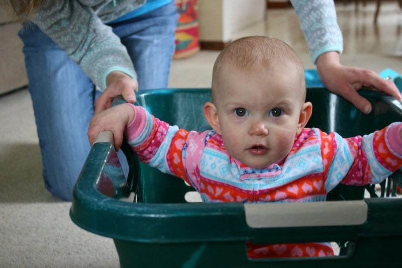 Isabelle “helped” me with the laundry—a task she also does with her mom—by handing dried clothes for me to put away. Once done, she pushed her beloved baby doll around in the clothes basket. Izzy loves her baby, giving her hugs and reminding me of how Amber dragged her baby doll, Sal, around by the hair.