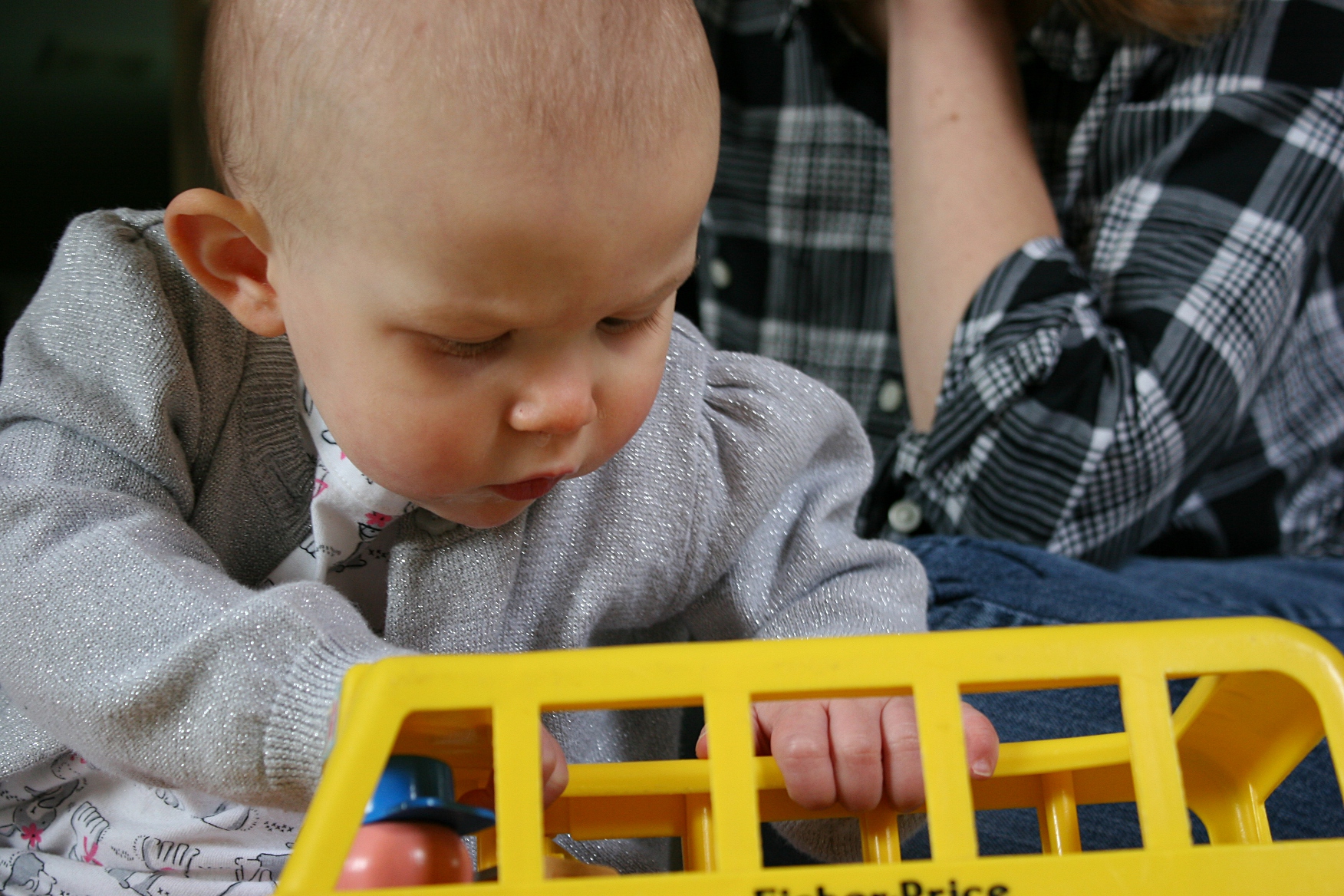 Izzy plays with the same Fischer Price bus her mama played with as a child.