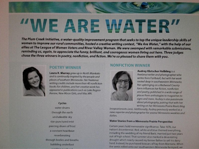 “Water Stories from a Minnesota Prairie Perspective” has published in southern Minnesota based River Valley Woman’s April issue. My story won the nonfiction category in the “We Are Water” writing contest sponsored by Plum Creek Initiative with the support of The League of Women Voters and River Valley Woman. That honor includes a $250 prize.
