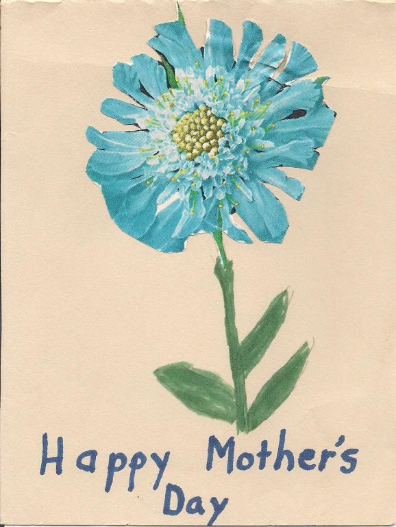 My mom saved everything, including this Mother’s Day card I made for her in elementary school. I cut a flower from a seed catalog to create the front of this card.