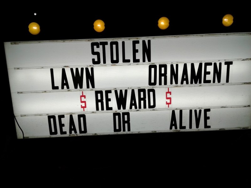In the vale of darkness bulbs flash, drawing attention to the message from an upset homeowner whose front door faces Central Park and whose yard is now minus an impressive wind spinning sculpture.