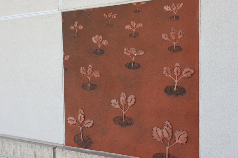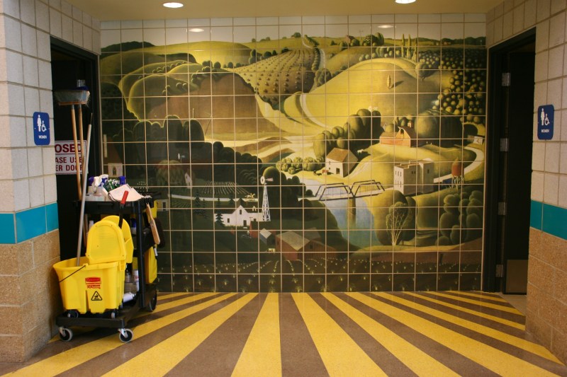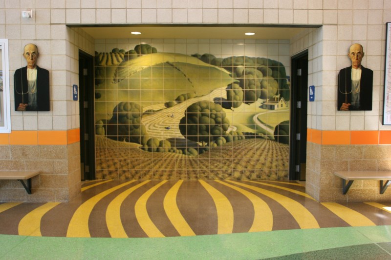 Wood’s work featured the rural Iowa landscape. Here his art is showcased in ceramic tile inside the rest area building.