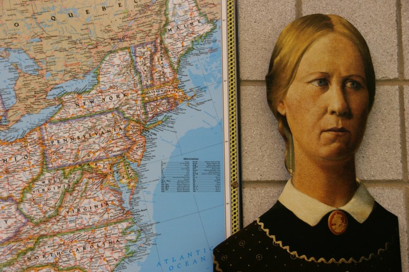 Travelers can get a view of the U.S. on a map situated next to a duplicate of the farm woman Wood painted in “American Gothic.”