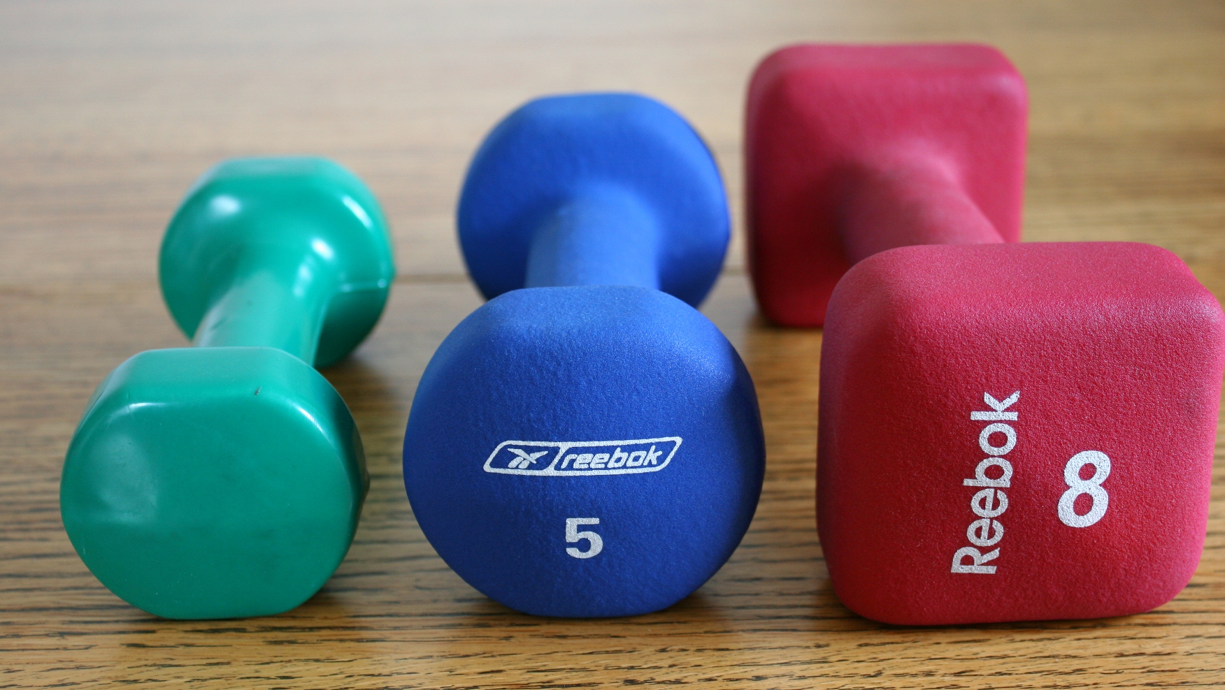 The weight of the dumbbells I could lift started at 1.5 pounds, then advanced to the 3, 5 and 8 pound weights shown here.